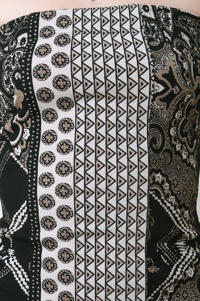 This bodycon dress features an elasticized tube neckline, stretchy sculpture fit, midi length hemline, and bohemian motifs pattern print. Accessories sold separately. Made in U.S.A. 95% Polyester, 5%Spandex.