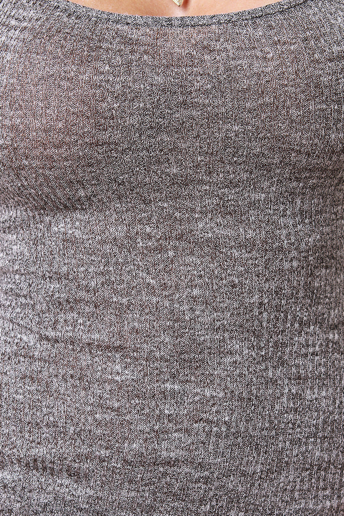 This midi dress features melange rib knit, u-neckline, spaghetti straps that criss-cross at back, and finished with side slit. Accessories sold separately. 68% Polyester, 29% Rayon, 3% Spandex.
