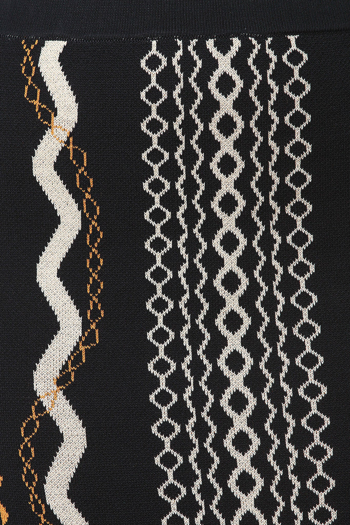 This sweater skirt features pattern design, stretchy sculpture fit, elasticized waist, and rear vent slit. Accessories sold separately. 65% Rayon, 35% Nylon.