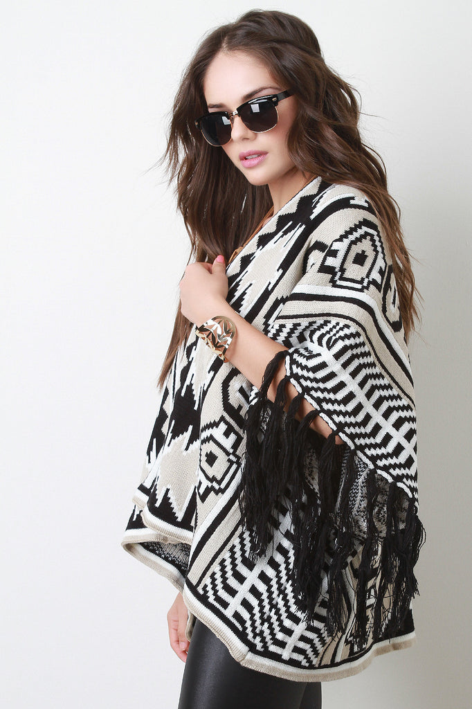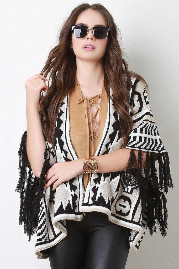 A tribal finely knit kimono featuring an open front, half sleeves with fringe tassels at hem, and a boxy cut. Accessories sold separately. 100% Acrylic.
